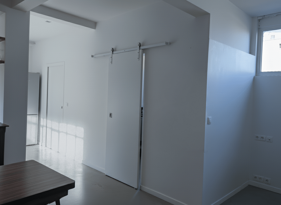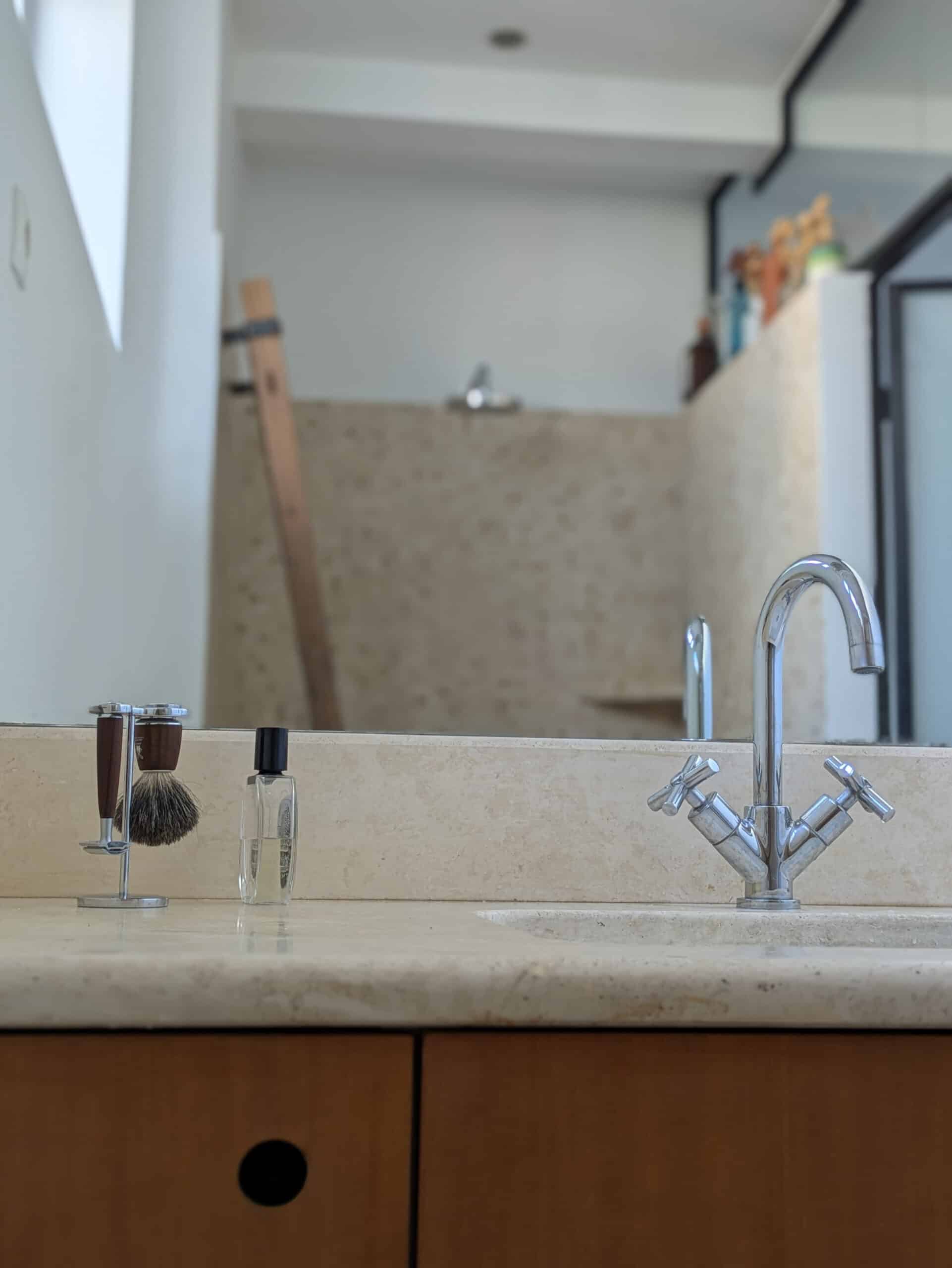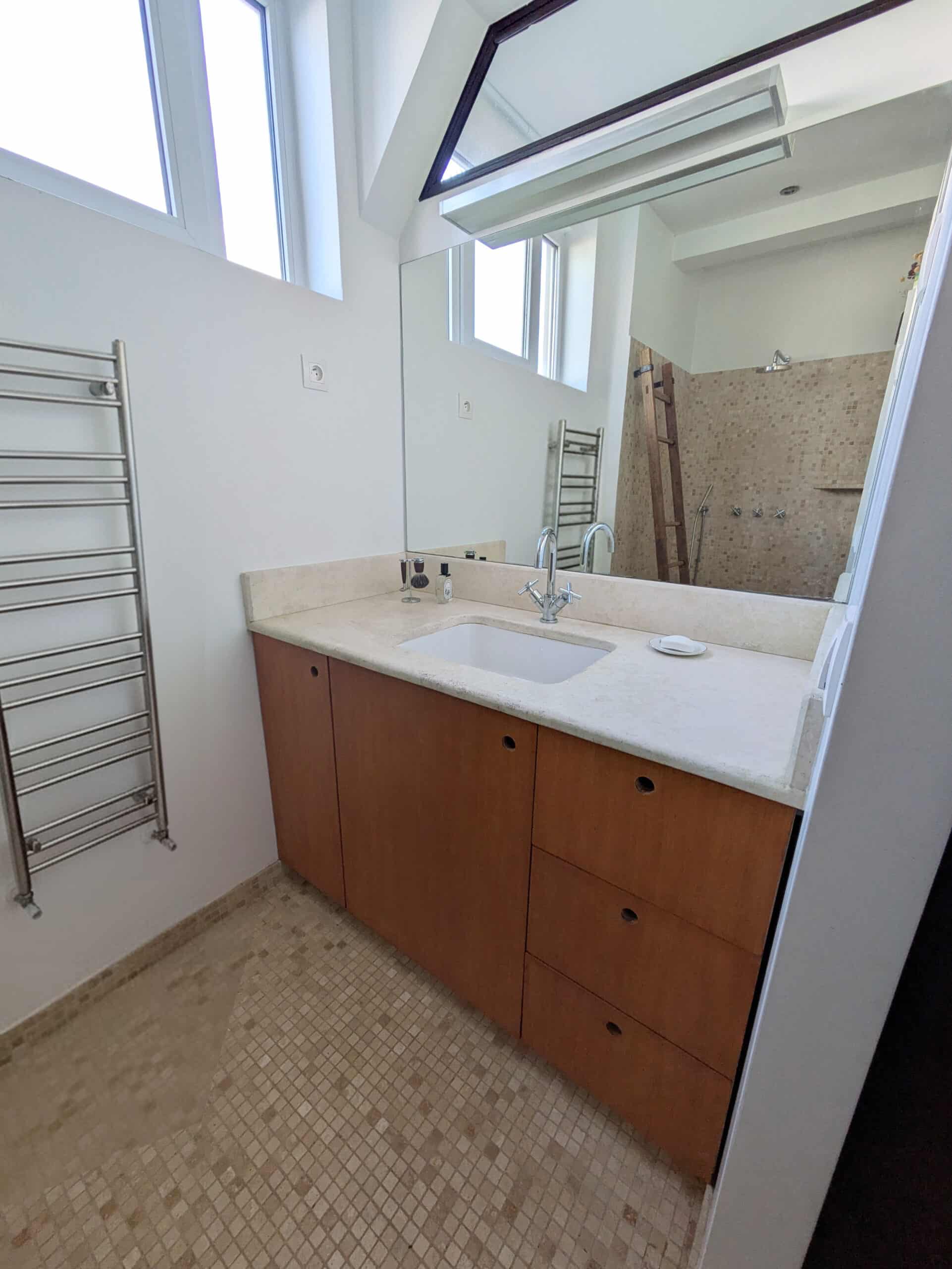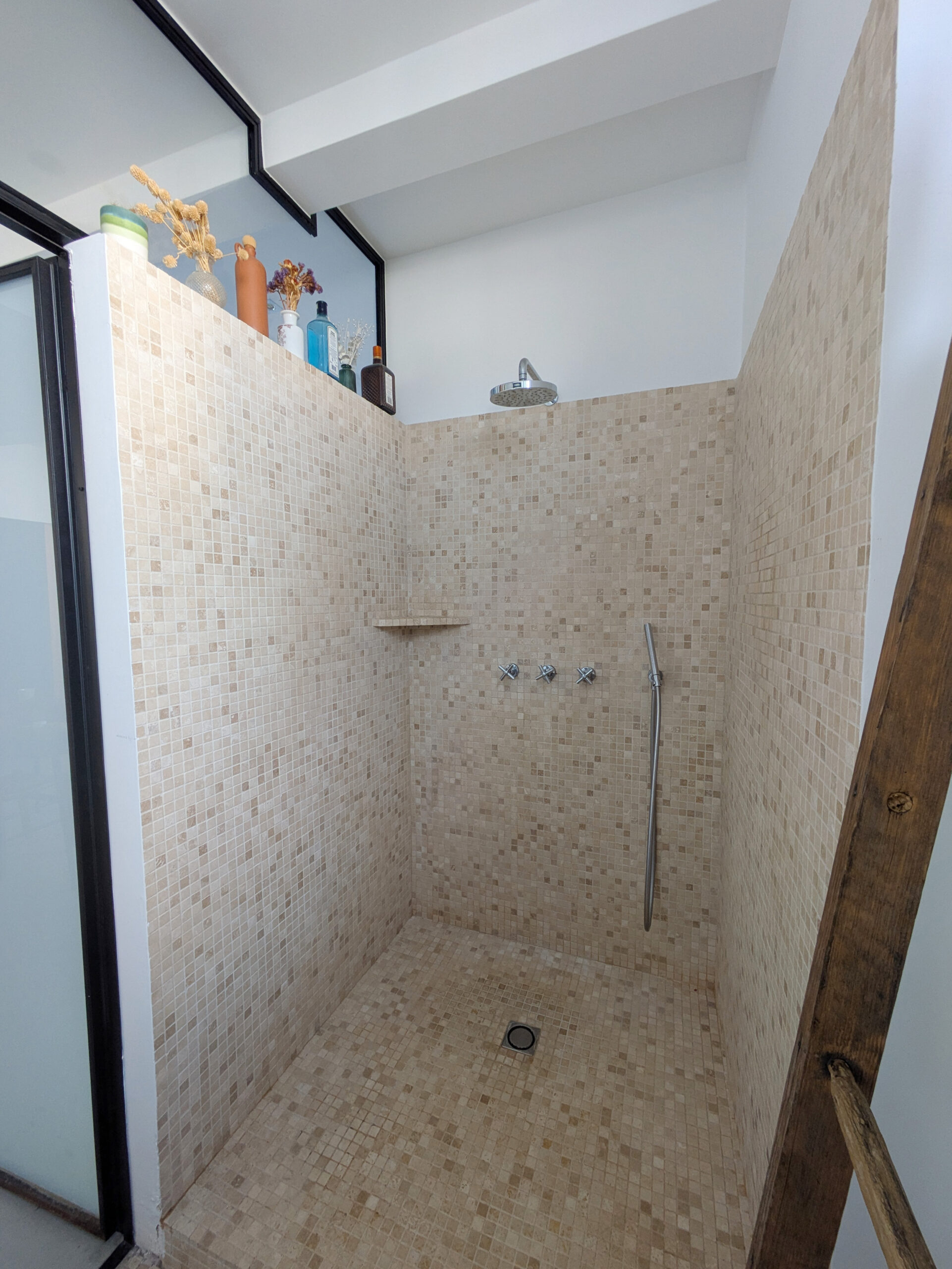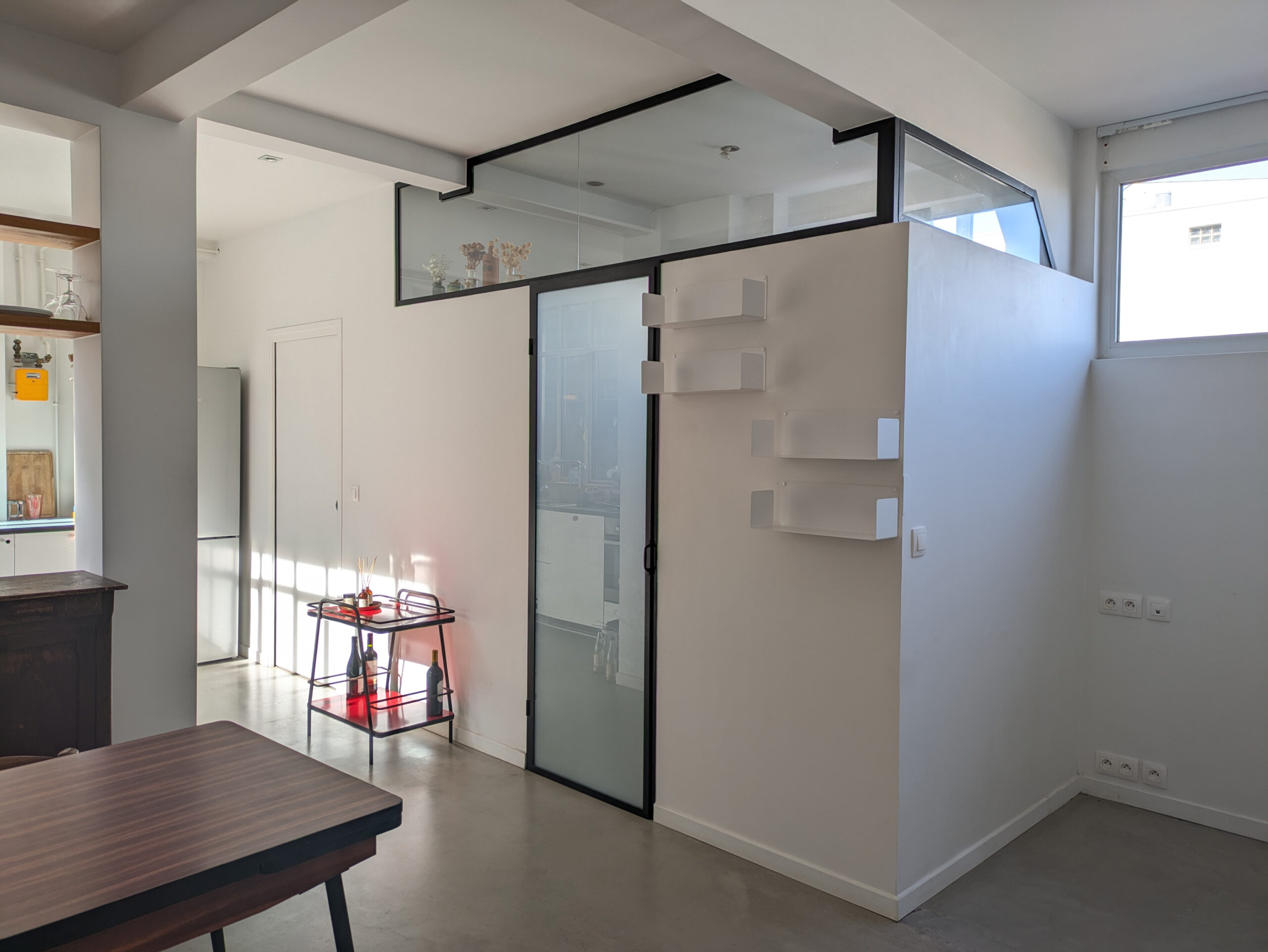 Programme : le propriétaire souhaite rafraîchir la salle d’eau de son appartement typique des années 1920 et apporter de la lumière à cette pièce terne et désuète. Les objectifs sont multiples : créer une porte vitrée et verrière en partie haute de la cloison existante ; remplacer les revêtements carrelés, créer un meuble vasque en travertin et une douche à l’italienne. Il est essentiel de respecter une esthétique architecturale sobre, en cohérence avec cette copropriété de caractère.